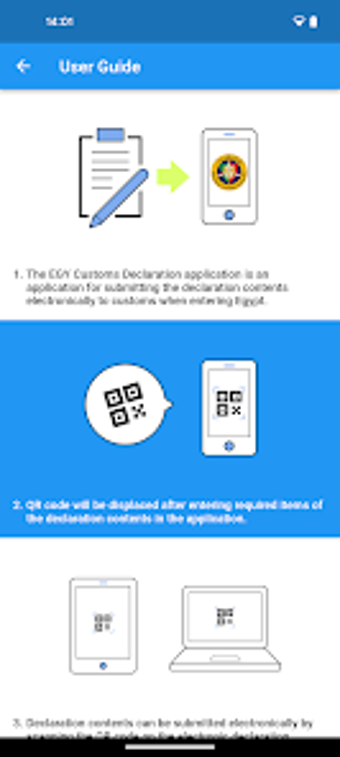 Aplikasi EGY Customs Declaration menawarkan kemudahan bagi para pelancong yang masuk ke Mesir dengan menyediakan fitur untuk mengajukan deklarasi bea cukai secara elektronik. Pengguna dapat membuat deklarasi bahkan dalam keadaan offline, sehingga sangat berguna saat persiapan perjalanan. Aplikasi ini juga menghasilkan kode QR yang dapat digunakan di bandara tertentu yang dilengkapi dengan terminal deklarasi elektronik di area pemeriksaan bea cukai.